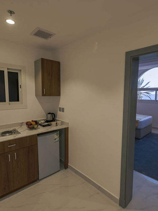 Our team has professionally designed the Sharaf Hotel, which, at thirty years old, received a makeover infused with creativity. We meticulously executed the plan. The hotel comprises around fifty hotel apartments. The ground floor features the entrance, reception, restaurant, dining hall, administrative offices, cafes, and numerous amenities like lounges, spas, and more.